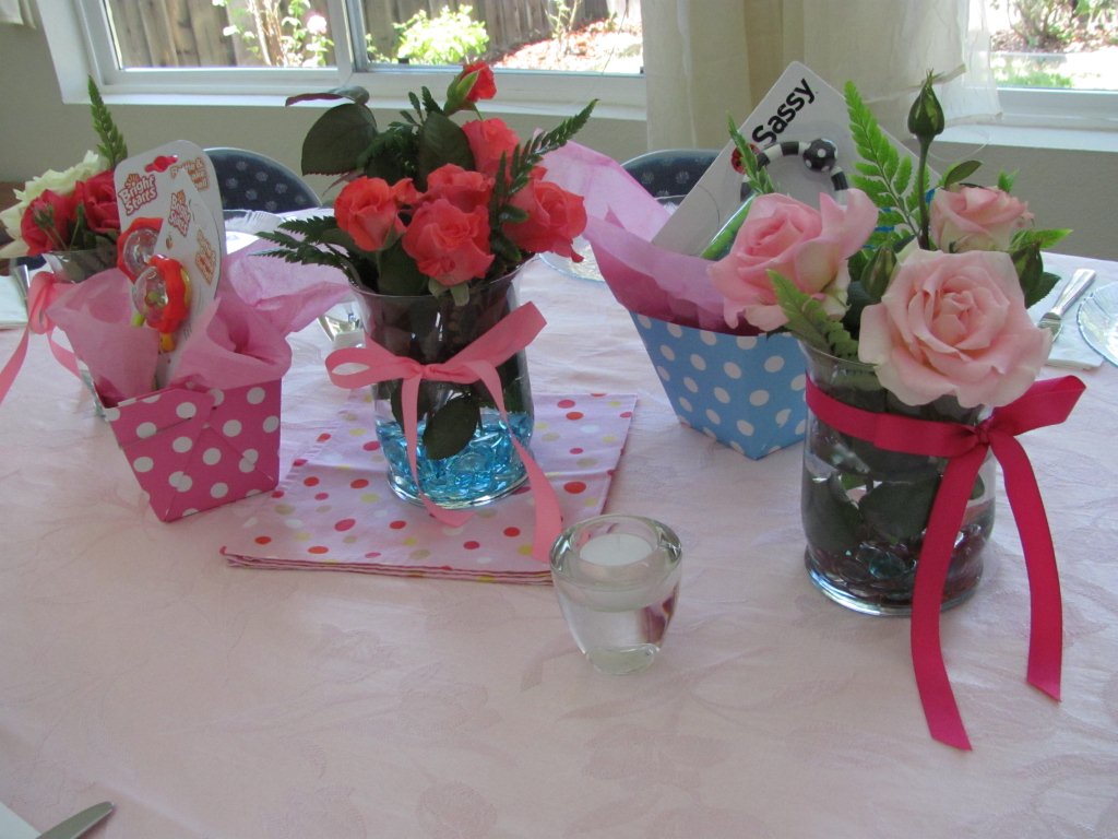 My mom was also invaluable to our shower preparations. In addition to many behind the scenes details, she helped by making two of the salads and decorating the lunch tables. For the table centerpieces she arranged baby toys in cute polka dot boxes. She also used fresh roses, candles, and polka dot napkins to decorate the tables. Everything was so adorable and pretty!